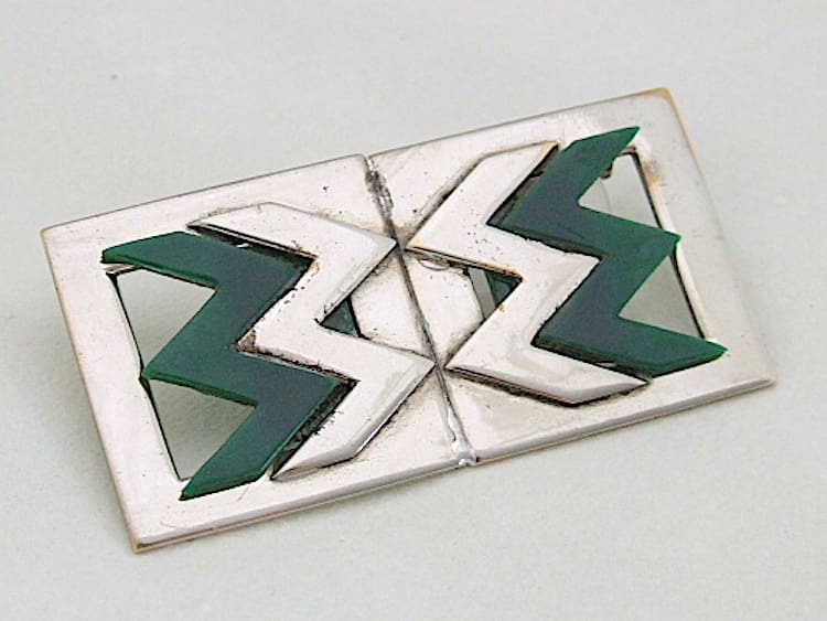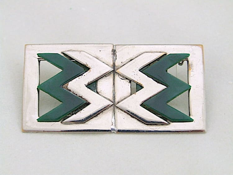 Art deco chromed metal and green galalith zigzag brooch by Jakob Bengel. Made in the early 1930s and never sold and is fitted with a roll safety clasp.