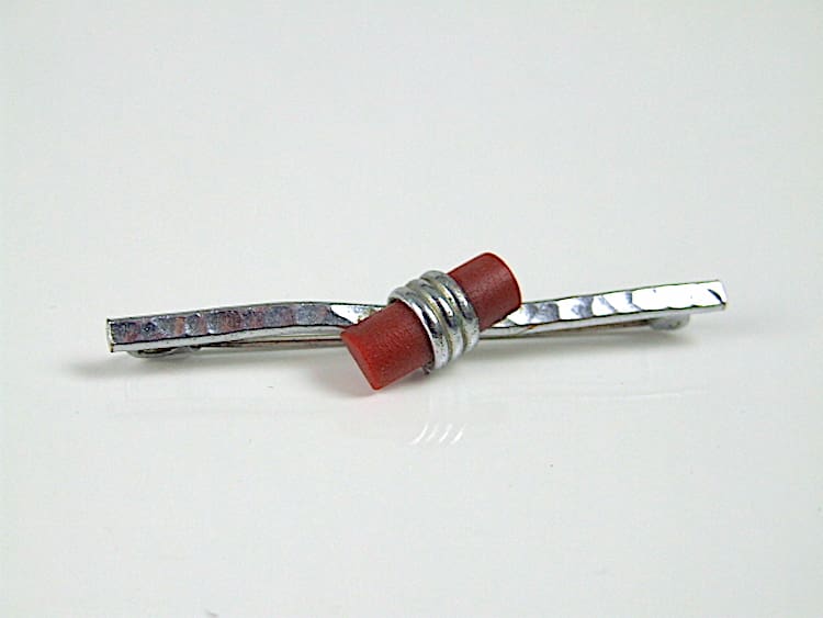 Delicate modernist red galalith and chrome brooch, made by Jakob Bengel in the 1930s.