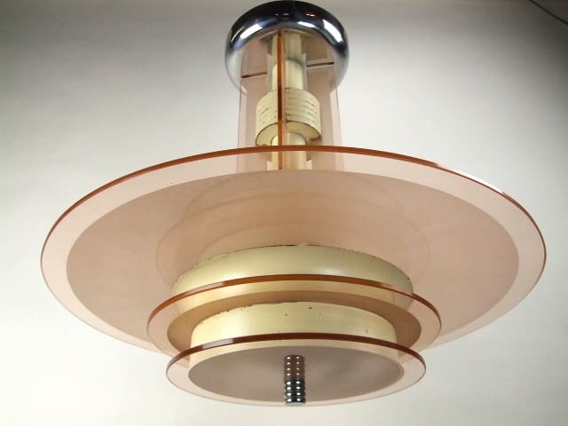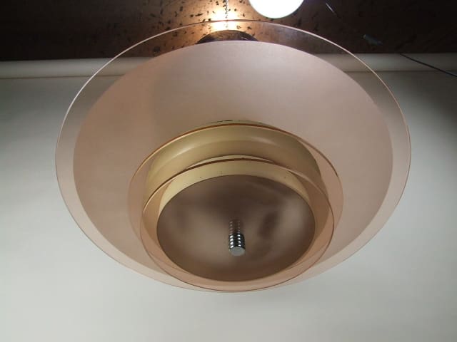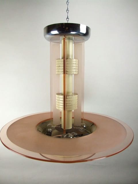 Central wood and metal column supporting 3 saturn rings and vertical frosted and tinted glass panels.