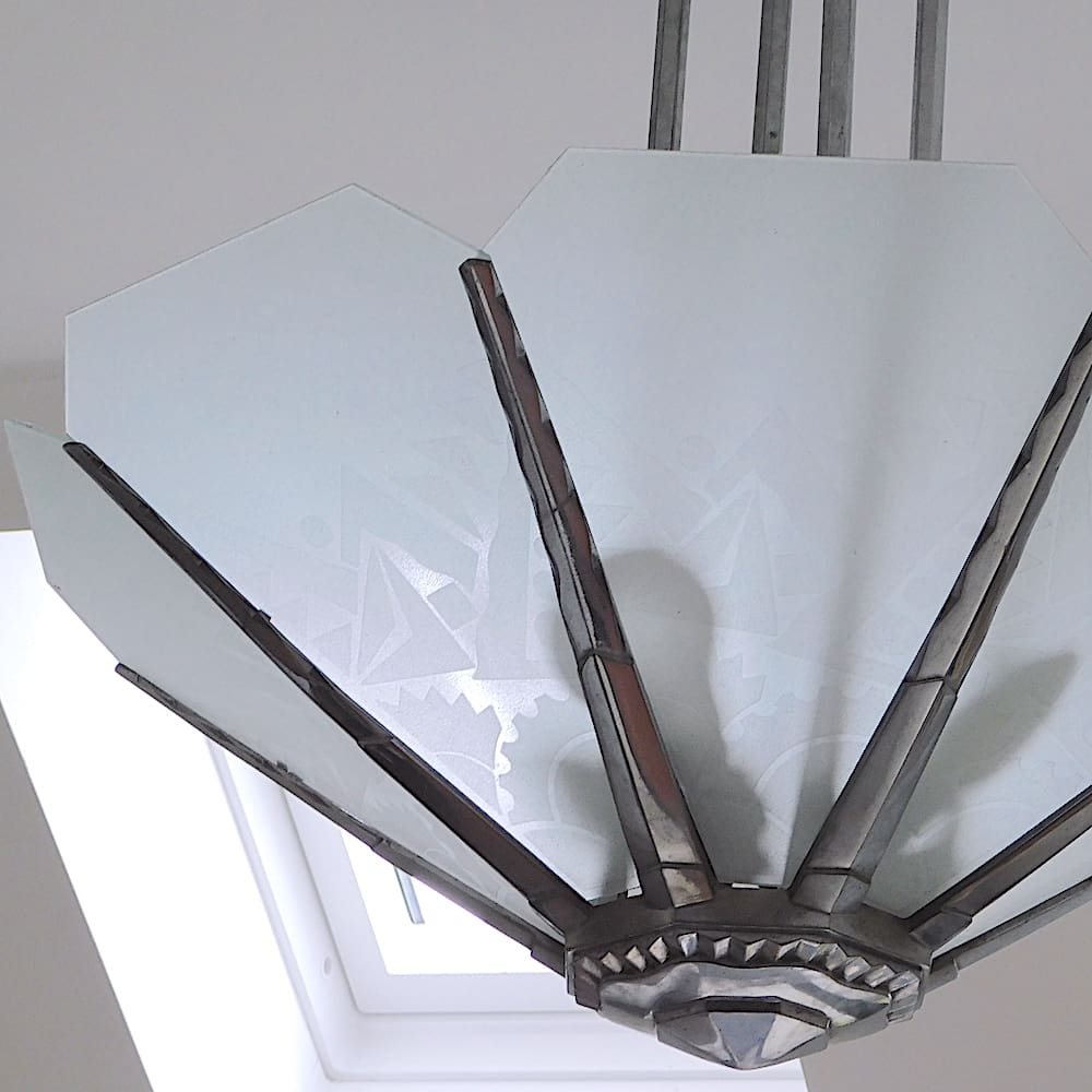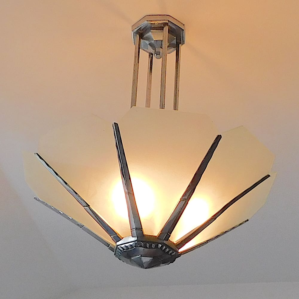 French Art Deco ceiling light. Hung from an octagonal ceiling rose and has 8 glass shades which sit in solid metal arms with lovely zig-zag detailing.