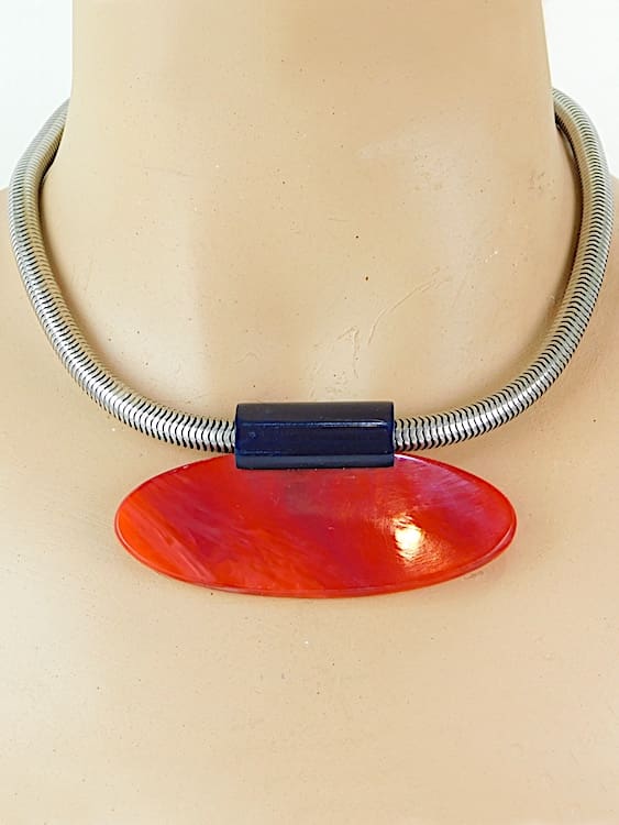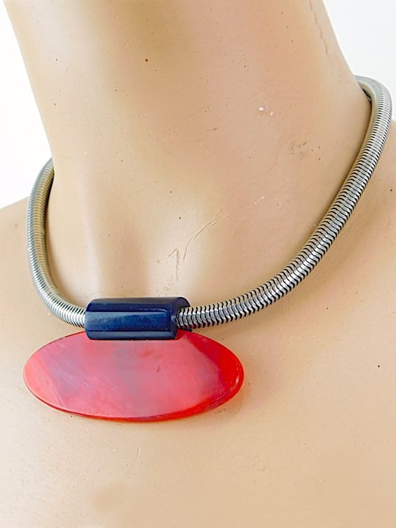 Early 1930s art deco Jakob Bengel necklace made of red and black galalith on a chunky snake chain.