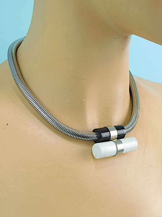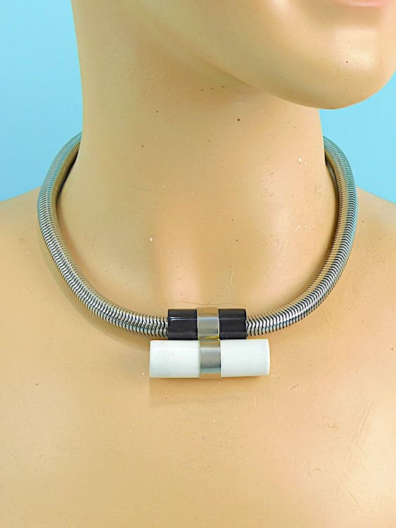 White and black galalith tubes on a chunky snake chain. Made by Jakob Bengel in the early 1930s and fitted with a screw clasp.