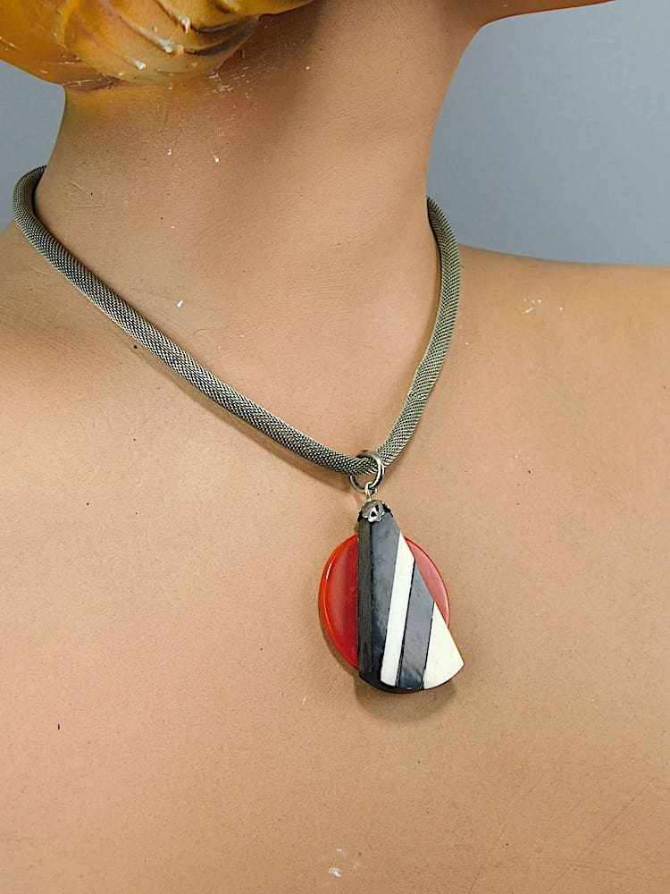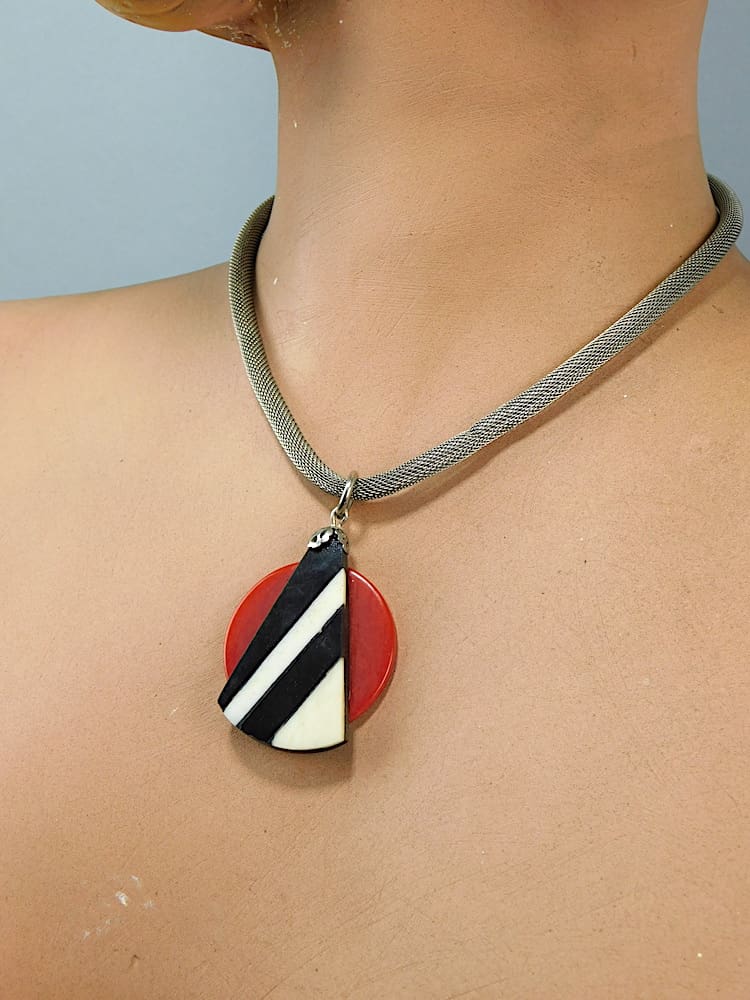 French mesh tube chain with central galalith pendant in red and black and white stripe. Made in the early 1930’s.