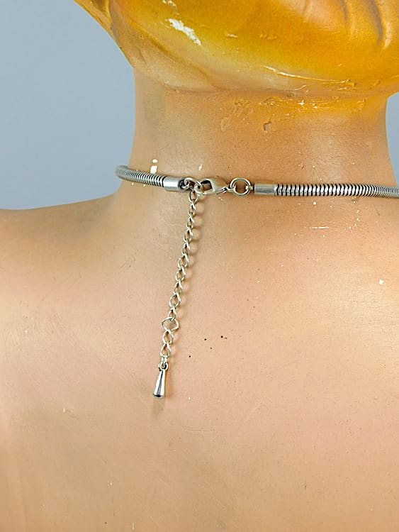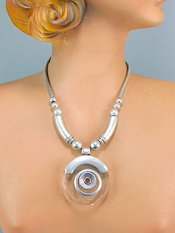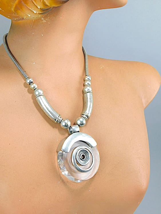 Chunky heavy aluminium and glass modernist Aztec style necklace. A contemporary piece with a very deco style. Can be hung at different lengths.