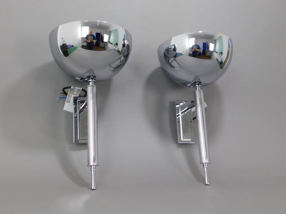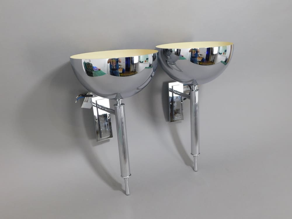 Top quality contemporary modernist art deco wall lamps – a remake of some old original cinema wall lights. Made of heavy chromed metal, with new modern wiring and large bayonet bulbs.