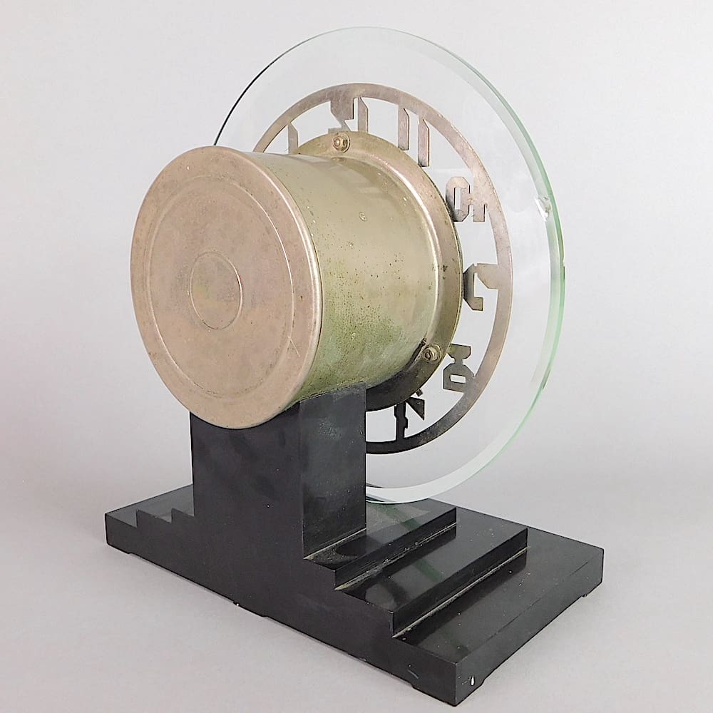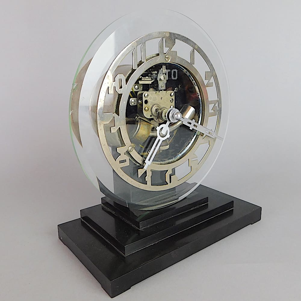 French modern art deco Leon Hatot (ATO) clock with black bakelite stepped base.