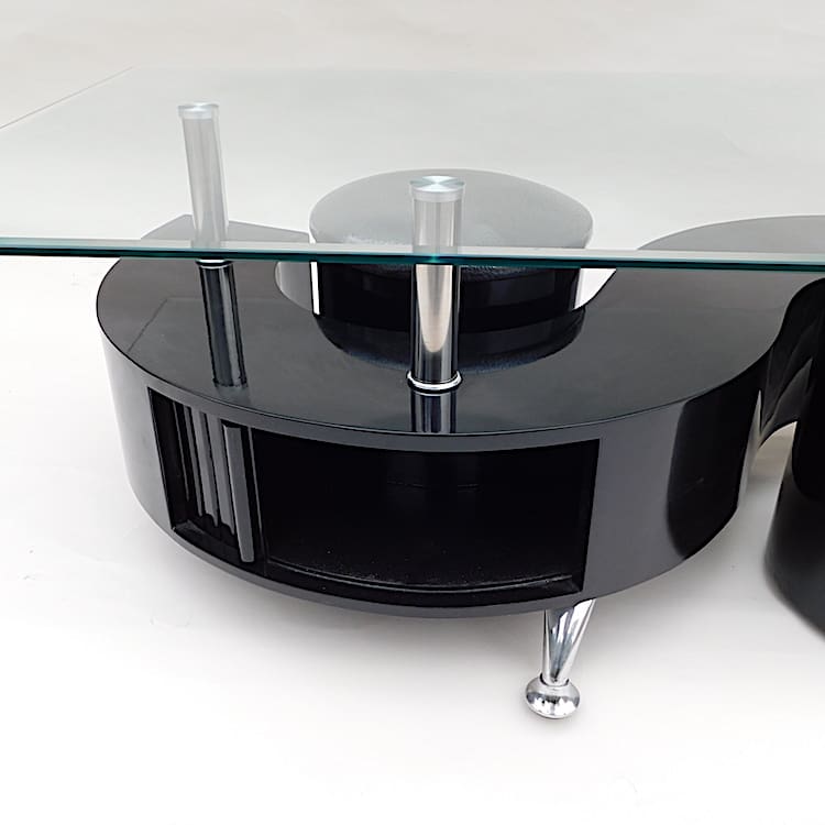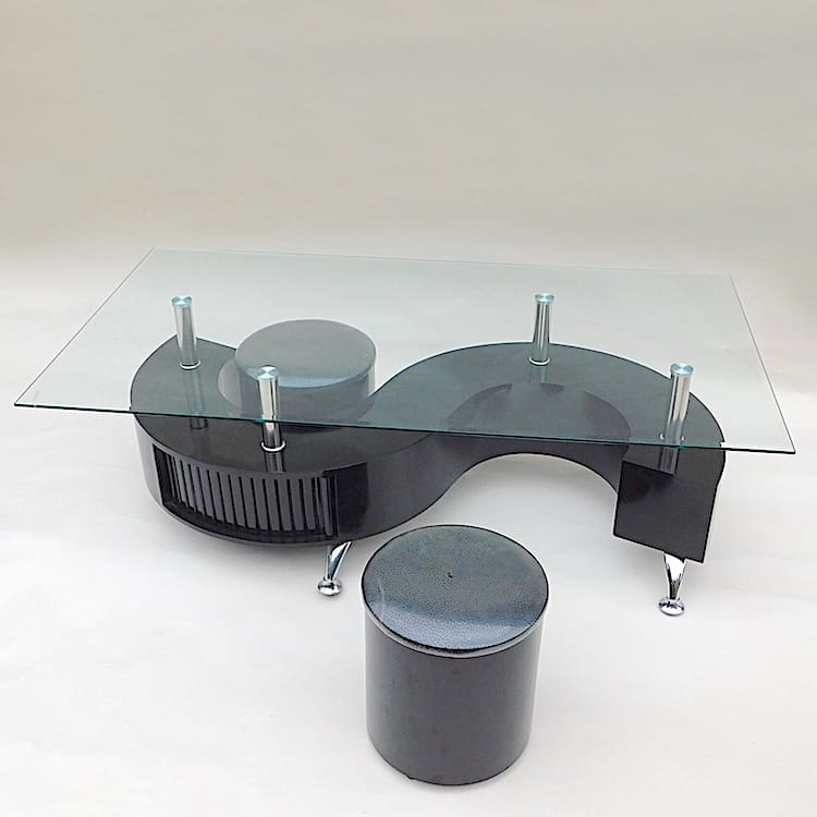 English art deco style black glass coffee table with 2 puff stools that slot underneath. It has tambour cupboard doors beneath. Probably made in the 1960s.