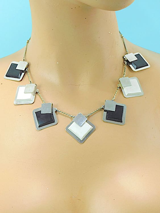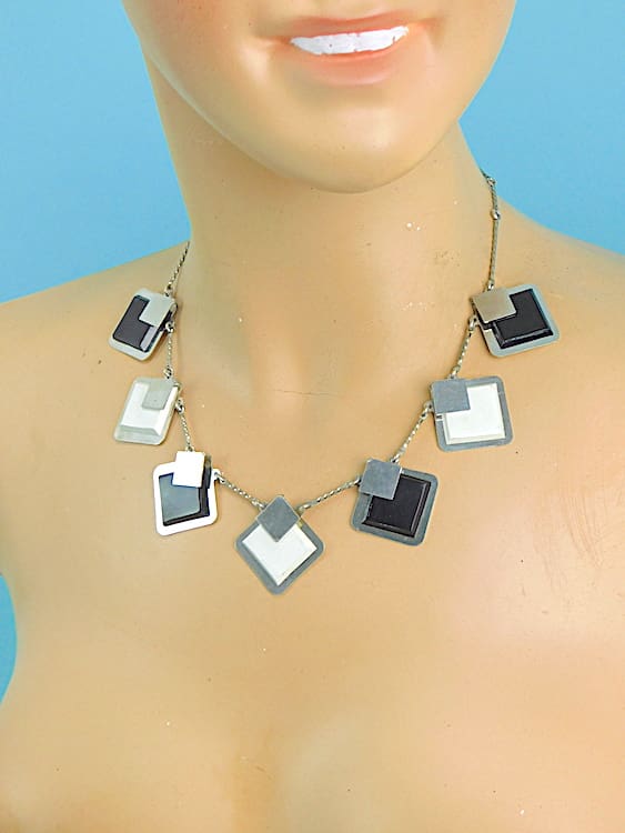 Early 1930s white and black galalith and chrome modernist necklace by Jakob Bengel.