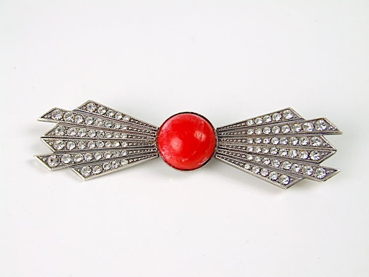 French red onyx and diamonte metal bow brooch. Fitted with a roll safety clasp.