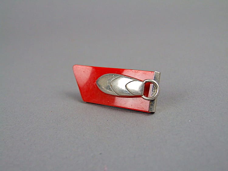 Red galalith modernist dress clip. Made by Jacob Bengel in the early 1930’s.