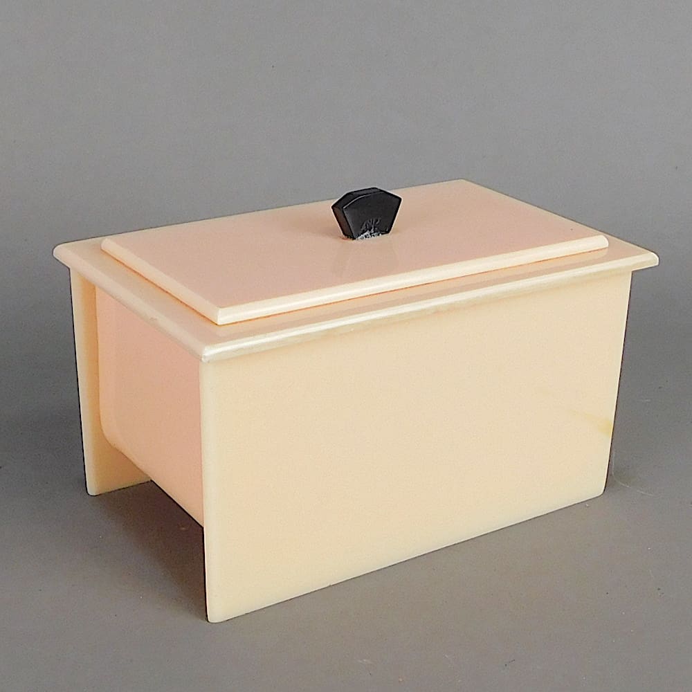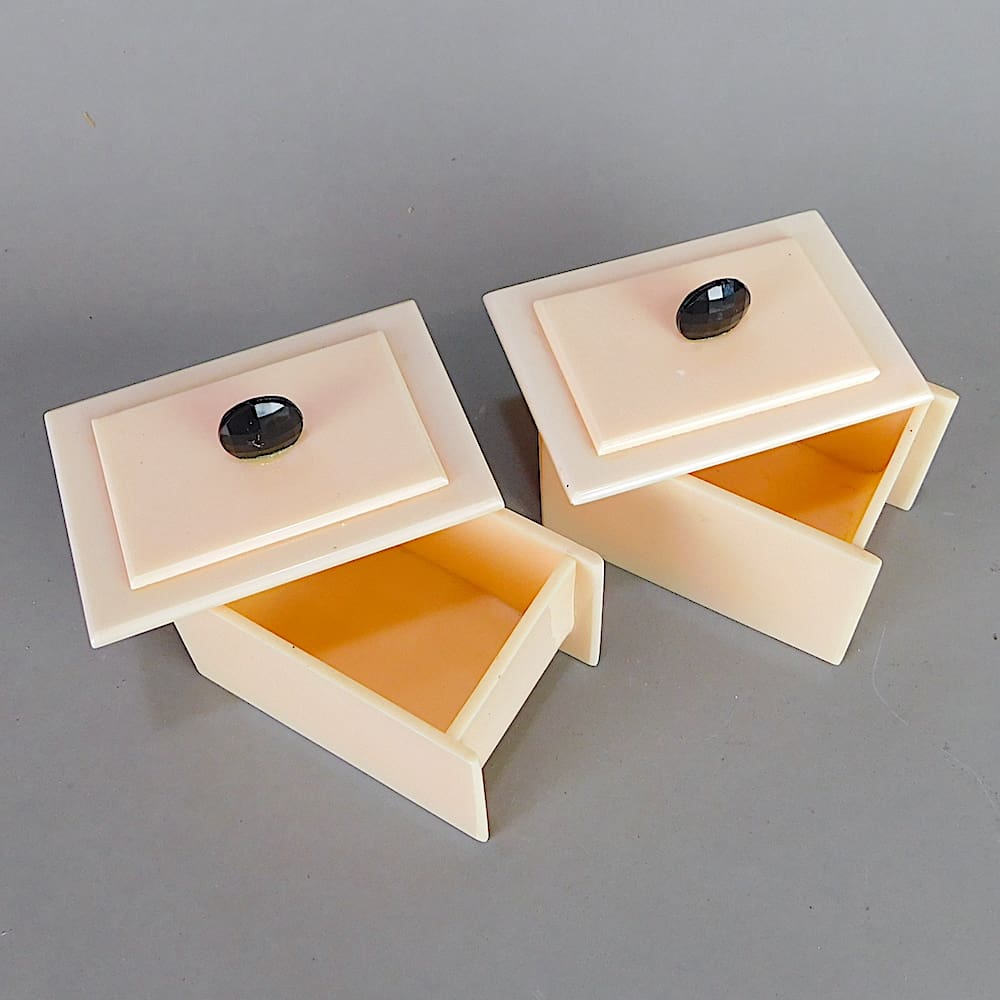 An art deco pale peach and black phenolic dressing table set.