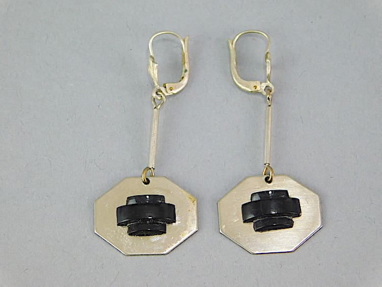 Chrome and black galalith earrings for pierced ears. Made in the 1930’s by Bengel.