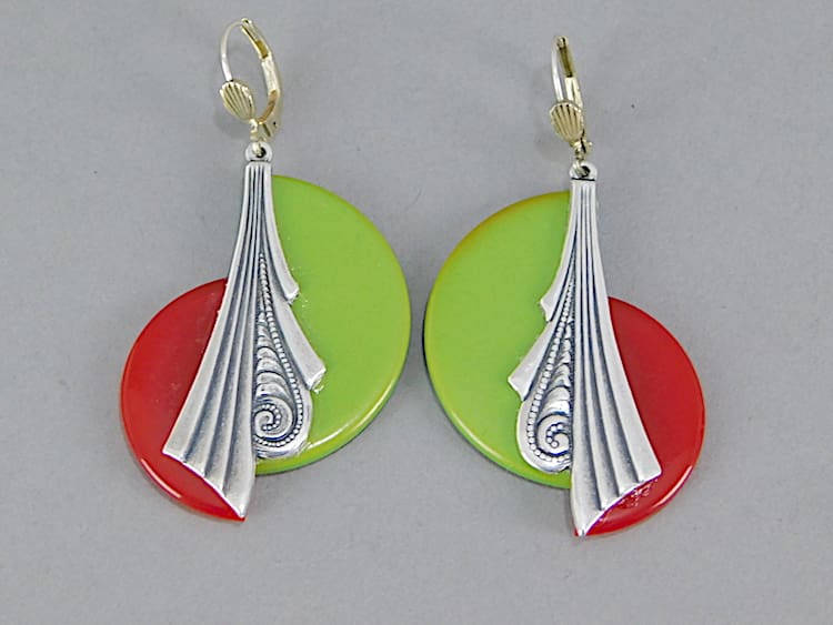 Large French vintage art deco green and red galalith and silvered metal scroll asymmetrical earrings for pierced ears.