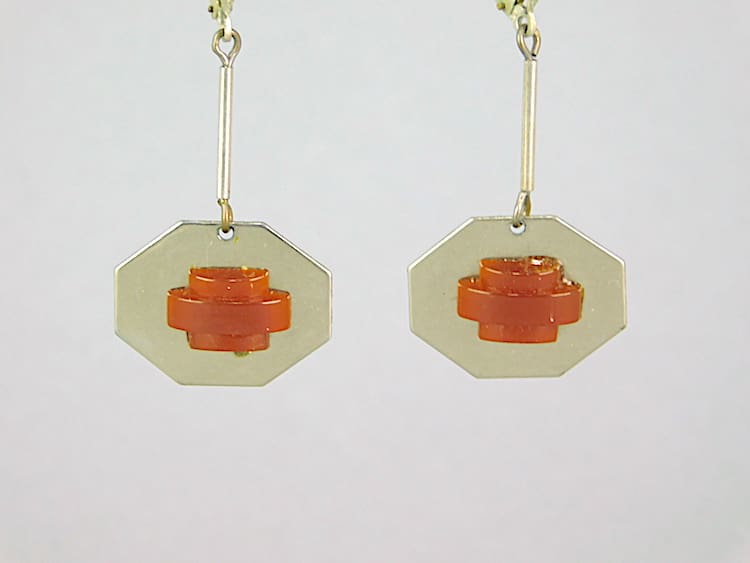Chrome and brown galalith earrings for pierced ears. Made in the 1930’s by Bengel.