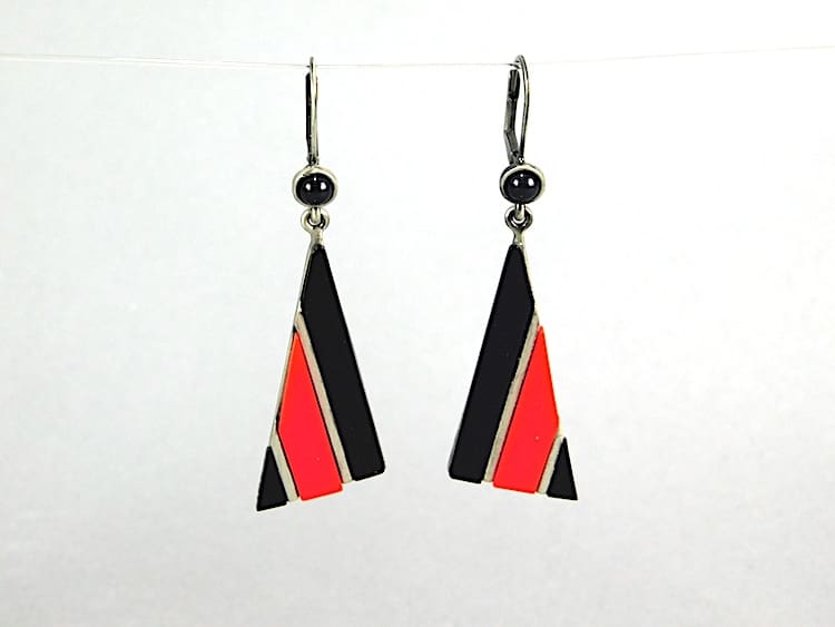 Art deco black and red galalith earrings for pierced ears, made by Jakob Bengel.