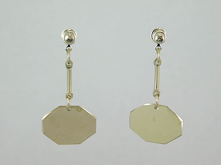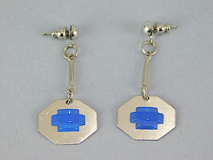 Chrome and blue galalith earrings for pierced ears. Made in the 1930’s by Bengel.