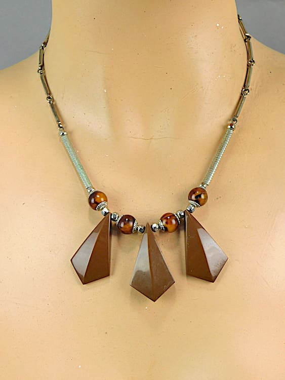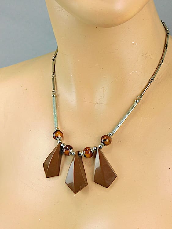 Brown and amber galalith fan necklace made by Jakob Bengel in the early 1930’s.