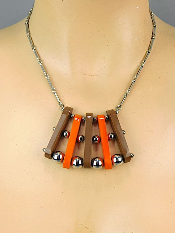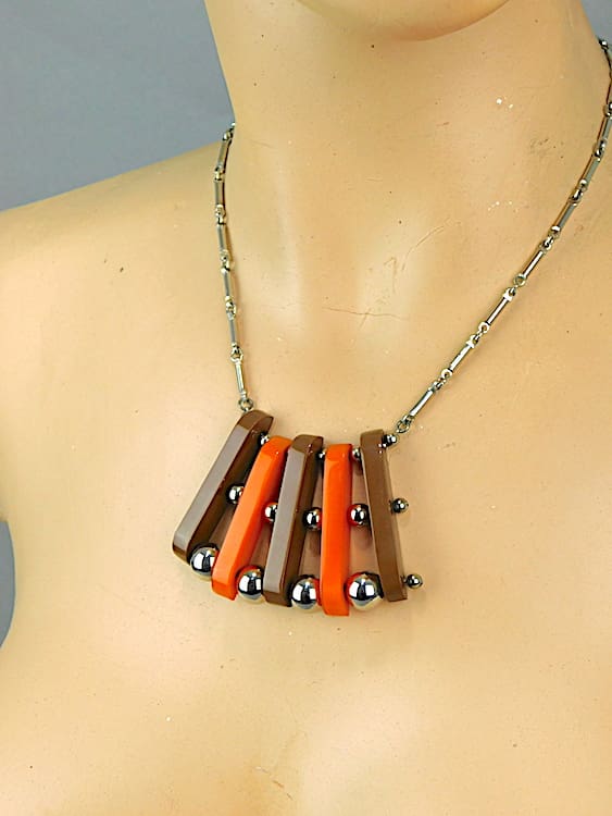 Orange and brown galalith with chrome balls, made by Bengel in the 1930’s.