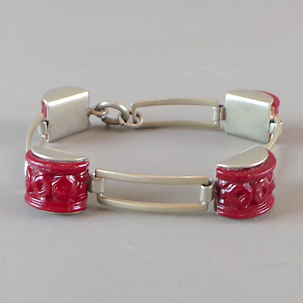 Modernist floral bracelet. Chrome bracelet with dark red floral moulded curved glass panels.