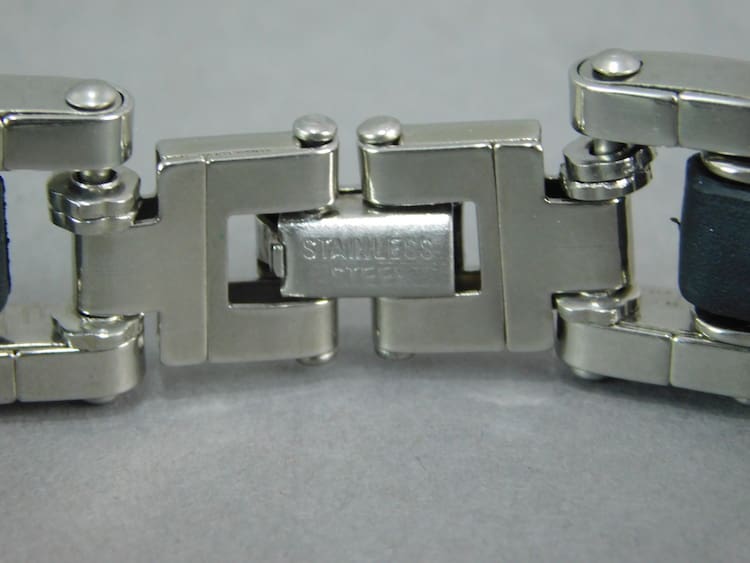 French stainless steel and black phenolic bracelet. Marked stainless steel to the clasp.
