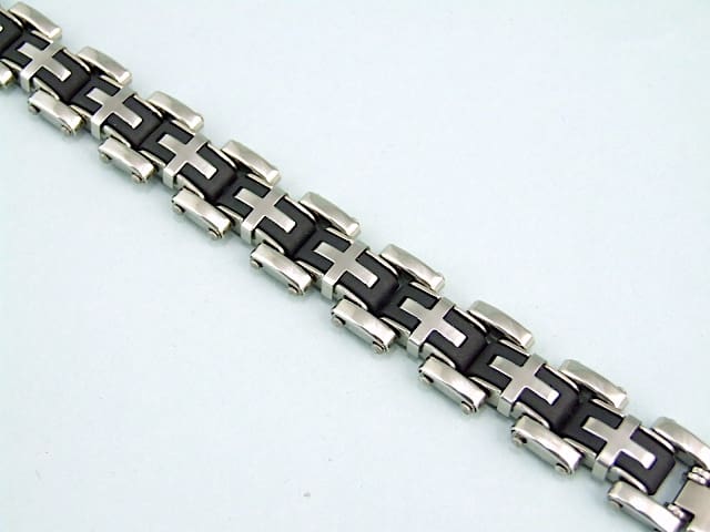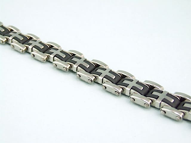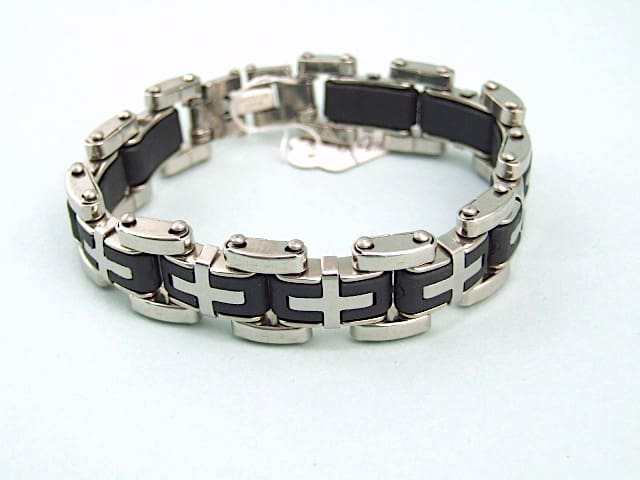 French stainless steel and black phenolic bracelet. Marked Stainless steel to the clasp.