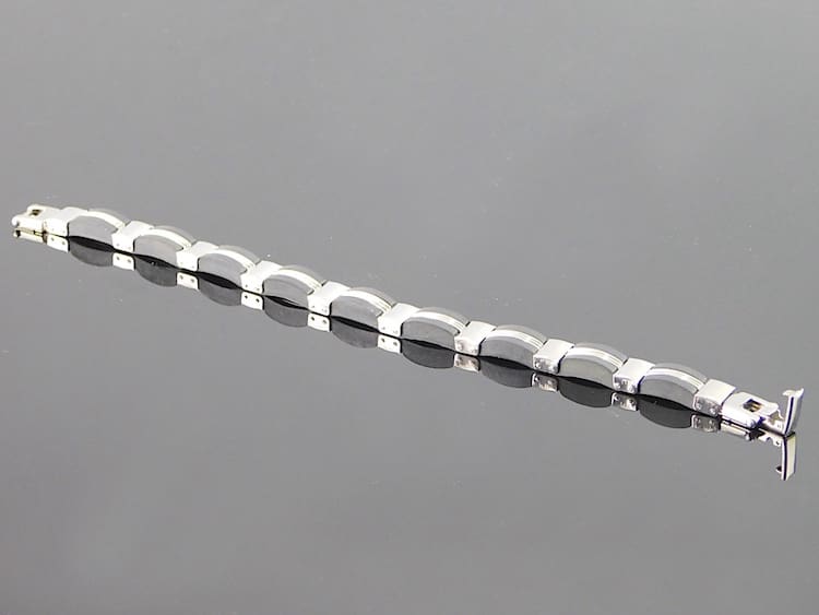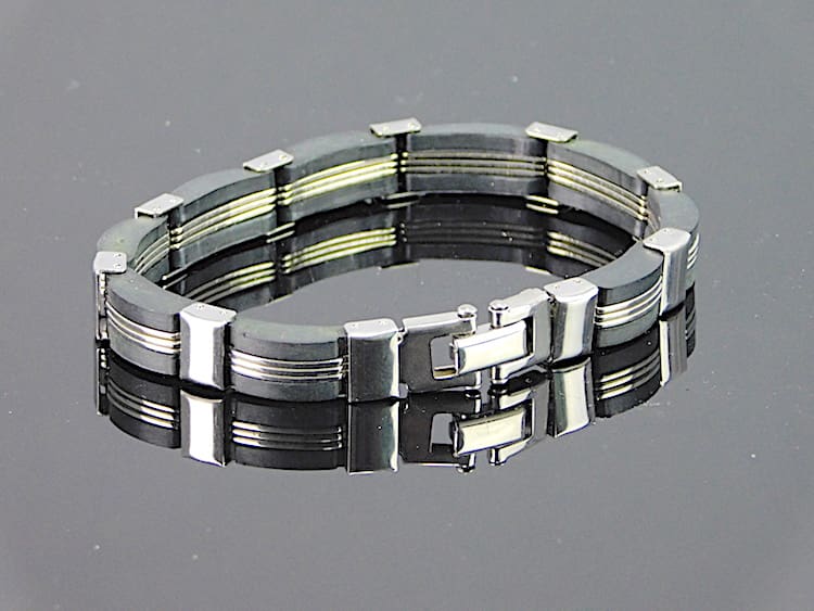 French stainless steel and black phenolic bracelet. Marked Stainless steel to the clasp.