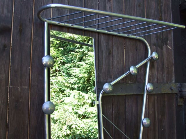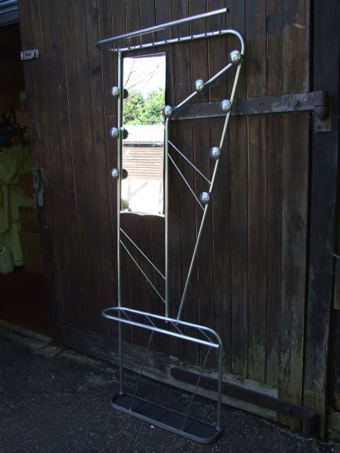 Very stylish French art deco stand with top hat rail, 9 coat knobs, mirror and umbrella stand section to the base with drip tray. Made of spun polished aluminium.