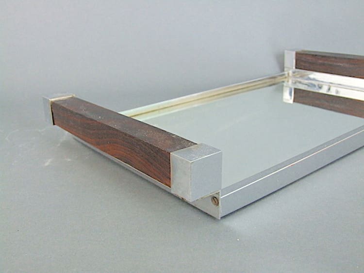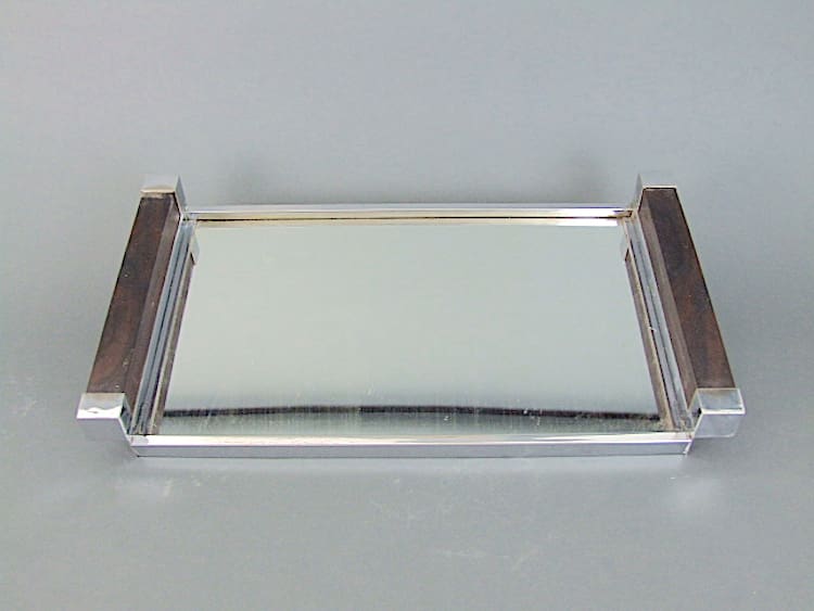 French macassar ebony, chromed metal and mirror glass base tray. Top quality item and heavy.