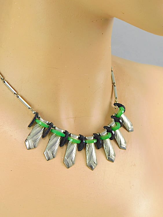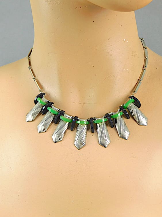 Green and black galalith Egyptian fringe necklace, made by Jakob Bengel in the early 1930’s.