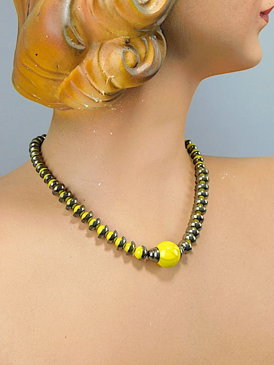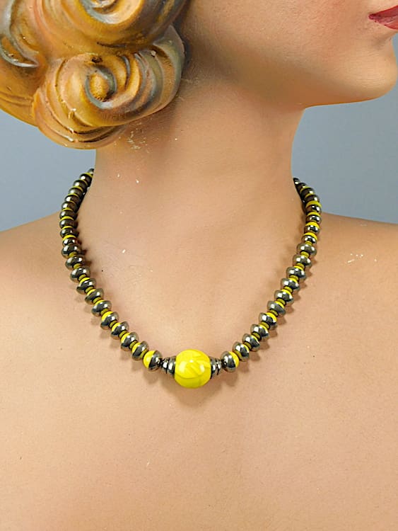 Stunning bright yellow glass and chrome cups necklace. Probably French or German and dating to the late 1920’s. Strung on chain.