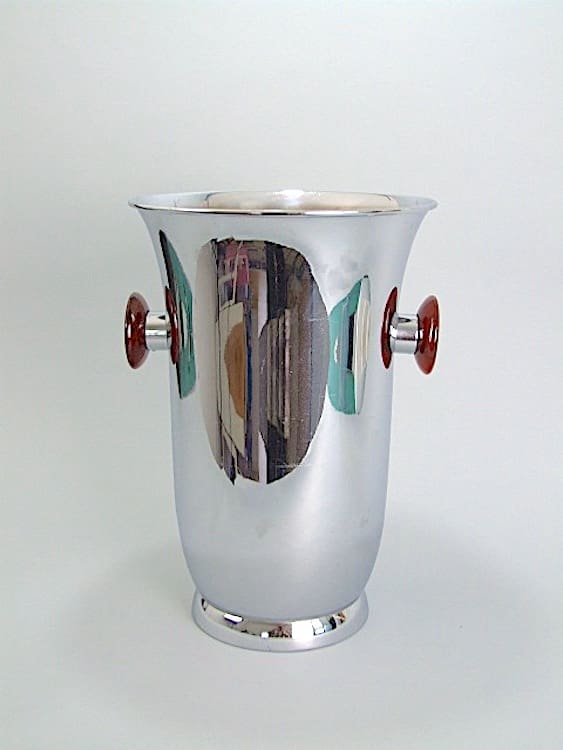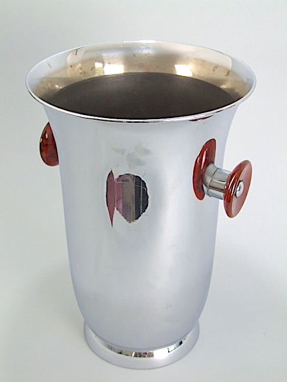 Large French modernist chrome ice bucket with late tortoise shell phenolic handles.
