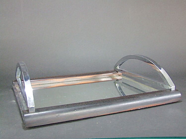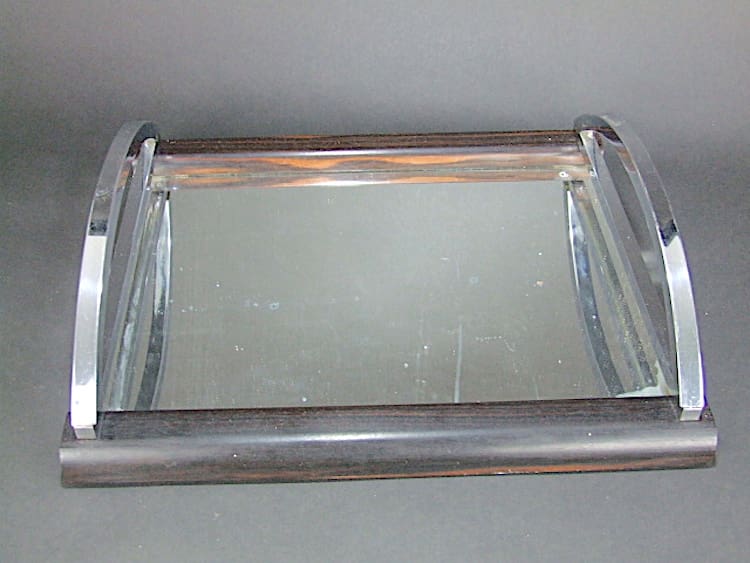 Top quality heavy French macassar ebony and chrome modernist tray. Possibly Adnet but unsigned. it has curved chromed handles and a mirror glass base.