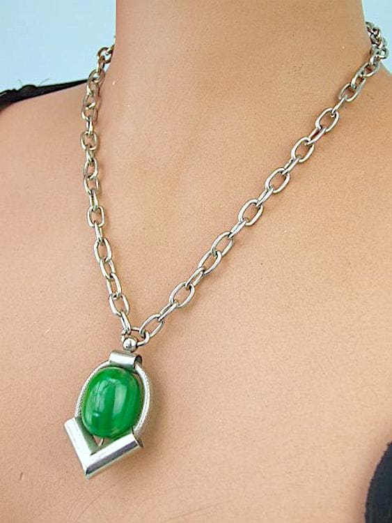 Green galalith and chromed metal pendant necklace.