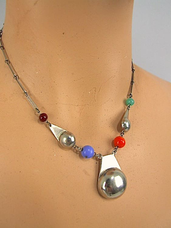 Chrome and multi coloured galalith delicate Bengel necklace. Made in the early 1930’s.