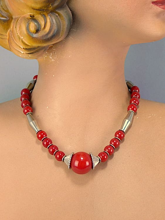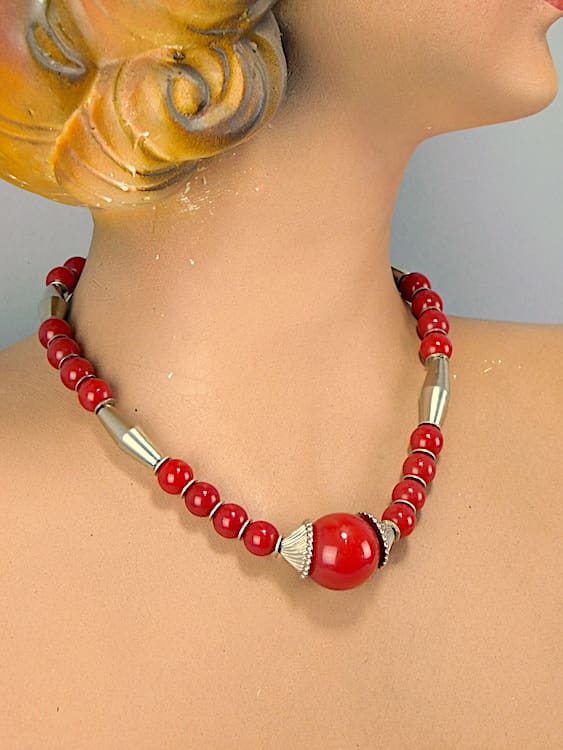 Unusual red galalith beads with patterned and ribbed chrome cones and very unusual chrome beads. Made in the early 1930’s by the Jakob Bengel factory.