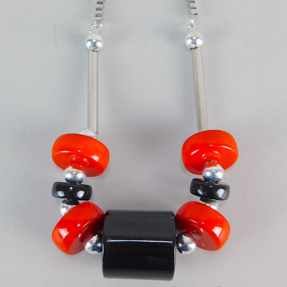 Art Deco modernist hand made red and black galalith and chrome necklace.