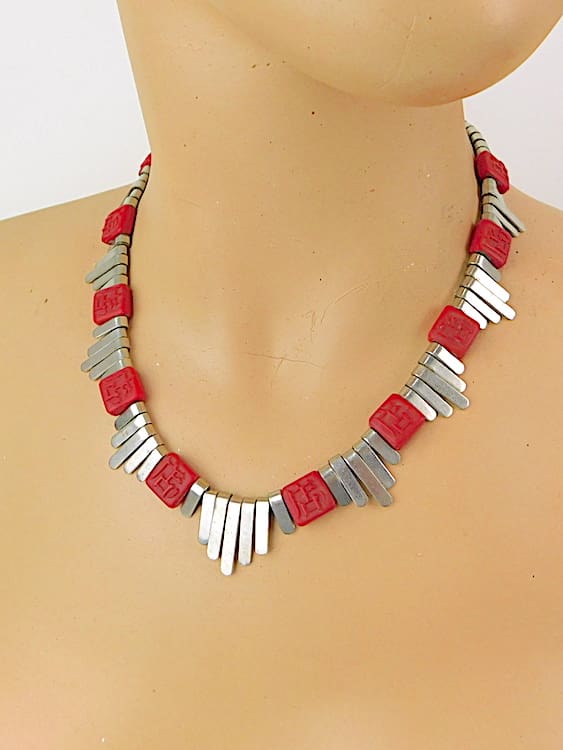 Stylish red glass with Chinese motif and chrome necklace by Jakob Bengel of Germany.