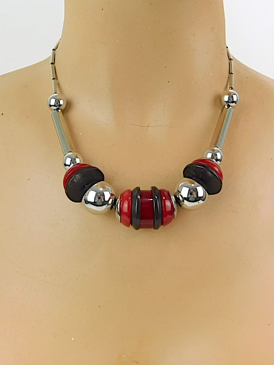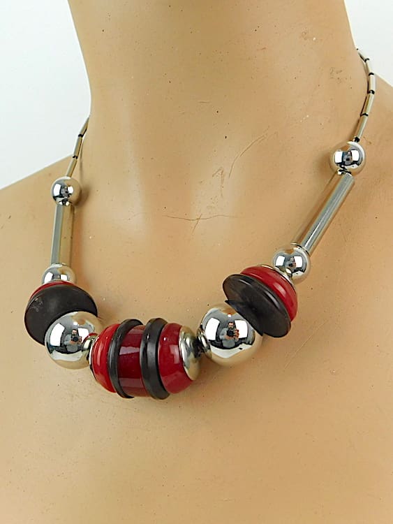 Red and black Galalith and chrome ball Art Deco modernist necklace. Made in the early 1930s by the Jacob Bengel jewellery company.