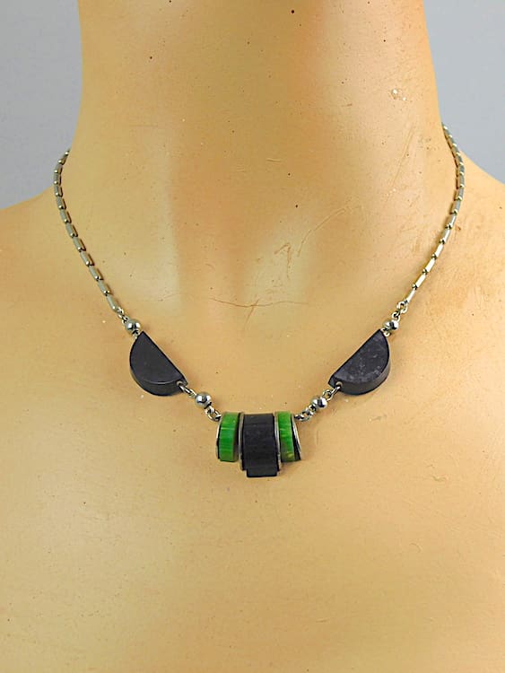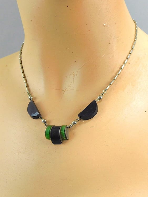 Black and green galalith 1920’s art deco necklace. Made by Jakob Bengel, this is a delicate piece.