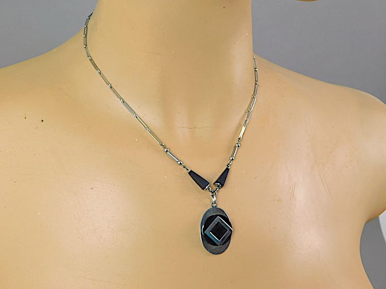 German modernist art deco black galalith and chrome necklace by Jakob Bengel. A more delicate piece. Circa 1930s.