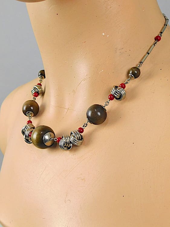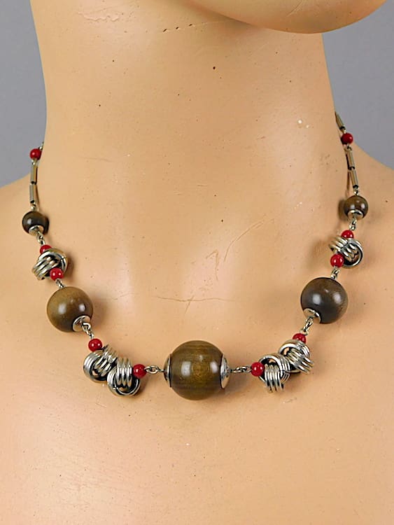 German modernist art deco wooden and red glass balls with twisted link detail – necklace by Jakob Bengel. Circa 1930s.
