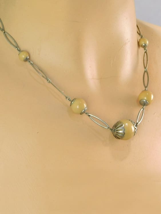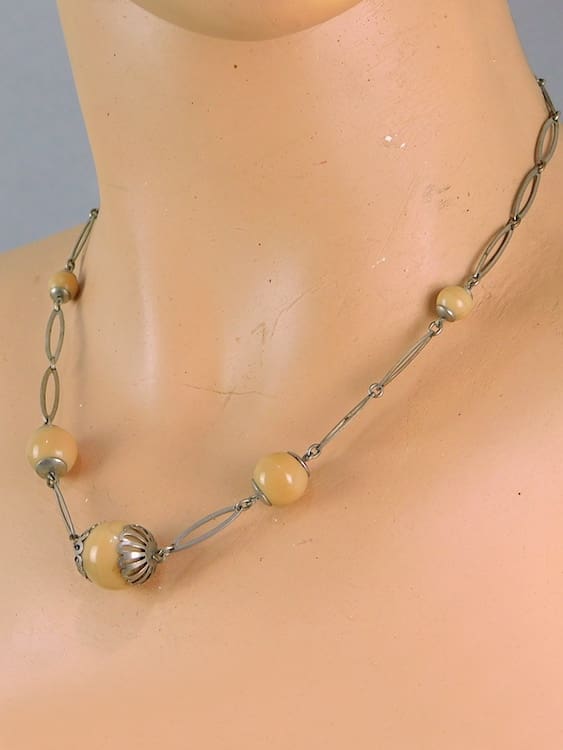 Beige galalith, and chrome modernist art deco necklace. Made by Jakob Bengel in the early 1930s.