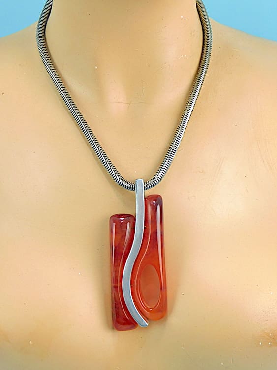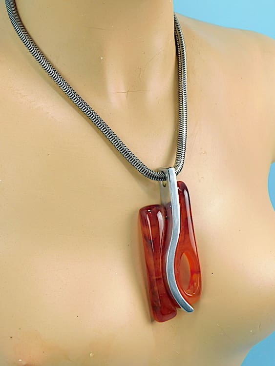 Amber galalith pendant on a chunky snake chain. An art deco necklace with a large 4 inch high pendant. Made by Jakob Bengel in the early 1930s.