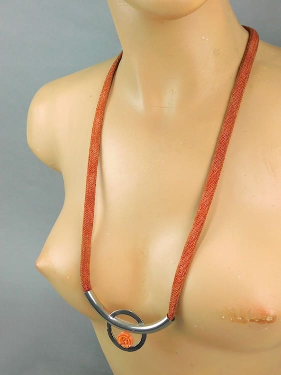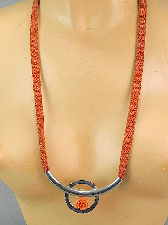 Bauhaus modernist early 1930’s Bengel necklace. Made from of chrome with central peach galalith rose on a peach cord. A similar necklace can be viewed in the Bengel book, page 236.