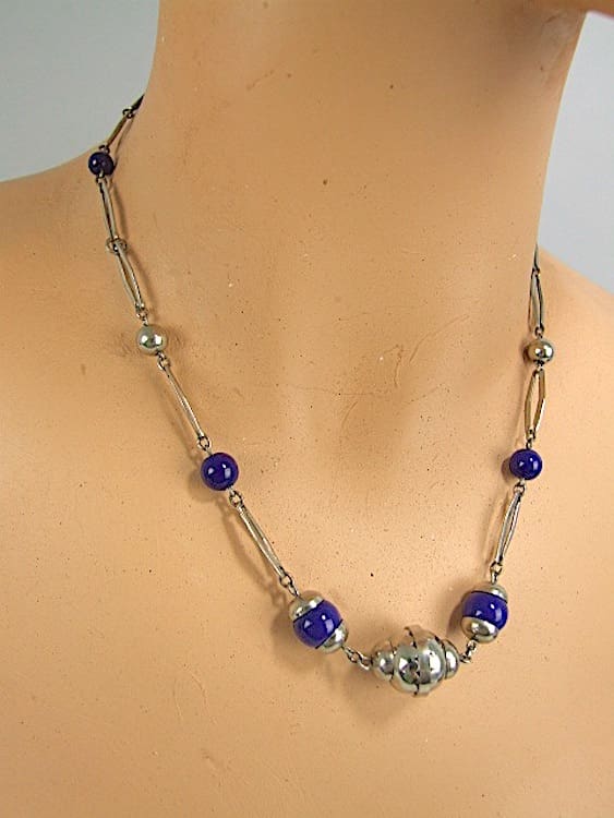 Jakob Bengel necklace made in the early 1930’s. Chromed metal cups with navy blue glass beads hanging on a very stylish chain.