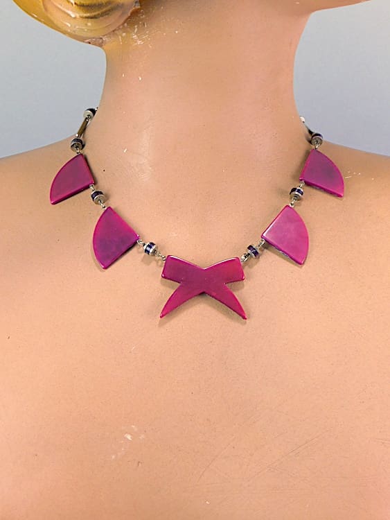 Made in the early 1930’s by Jakob Bengel. Damson coloured galalith with chromed metal panel detail. This necklace can be reversed to show just the galalith panels.