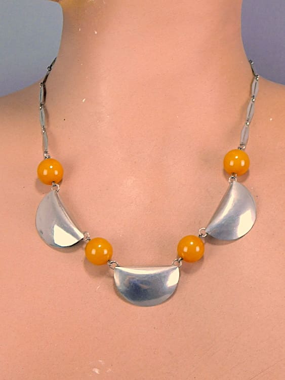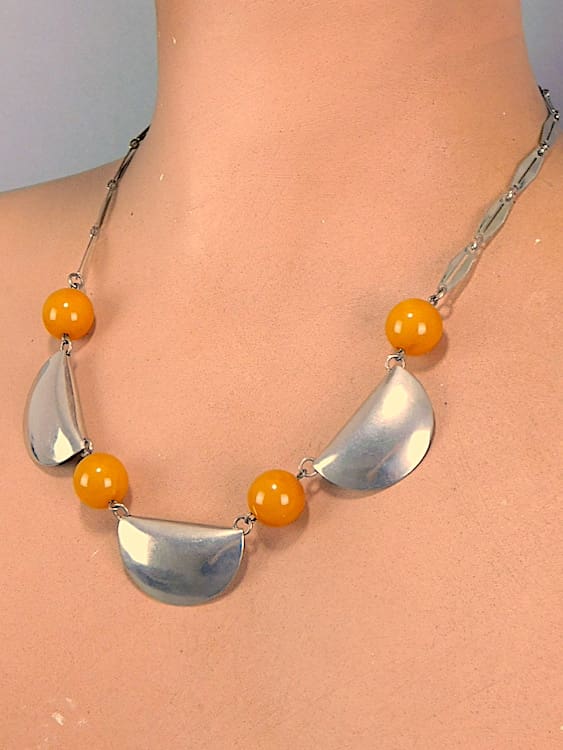 Chrome folded chrome semi circles with honey galalith balls necklace, made in the early 1930’s by Jakob Bengel.