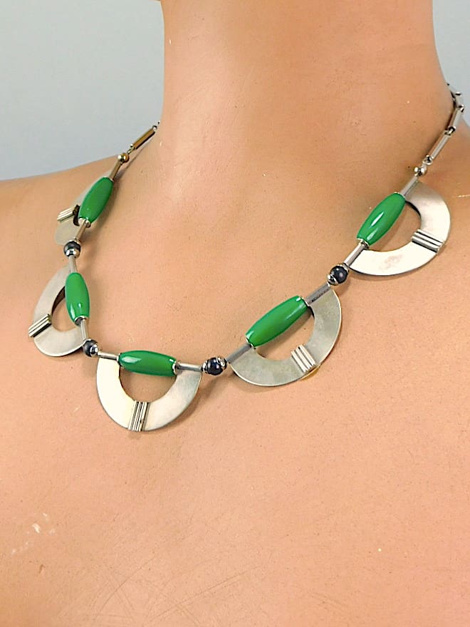 Wonderful modernist green and black galalith and chrome necklace by Jakob Bengel.