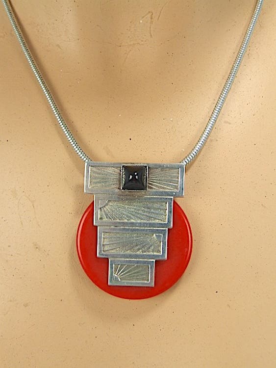 Odillon stepped silver metal and red galalith and black onyx stone. Strung on a snake chain.