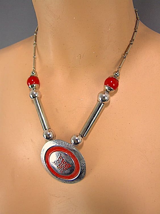 Chromed metal disc with red galalith balls.